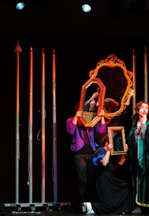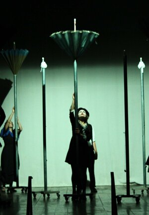 Lo scenario non è dipinto ma costruito con materiali più disparati che realizzano uno spazio immaginario, a volte confortevole, a volte espressionisticamente grottesco.