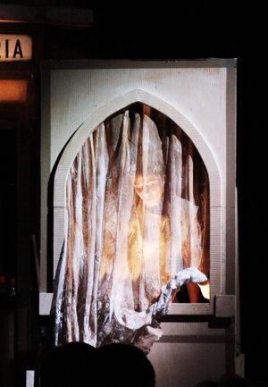 Aprendo le scatole, le voci parlano per bocca dei tre personaggi. Di queste memorie, alcune sono antichissime, altre più recenti e il loro disvelarsi, per qualche istante, tramite la voce della ragazza e degli altri due personaggi, costruisce la storia di un paese, di una regione che potrebbe essere l’Abruzzo, la Campania, la Basilicata, La Calabria o La Sicilia (tutti i personaggi a cui appartengono le voci, parlano in dialetto).